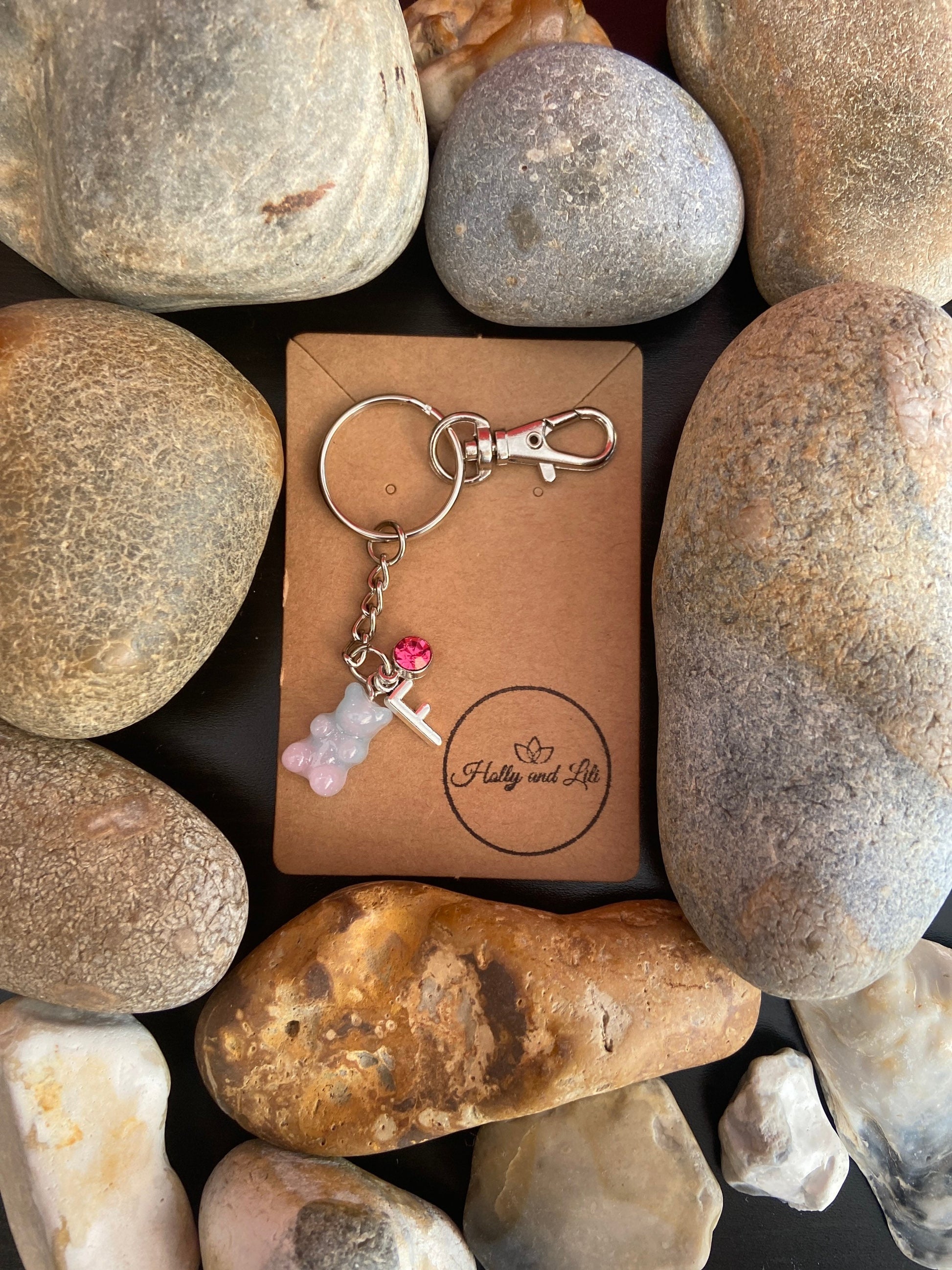 Blue Pink Gummy Bear Pendant Charm - Comes On A Steel Keychain With Detachable Lobster hook clasp .
