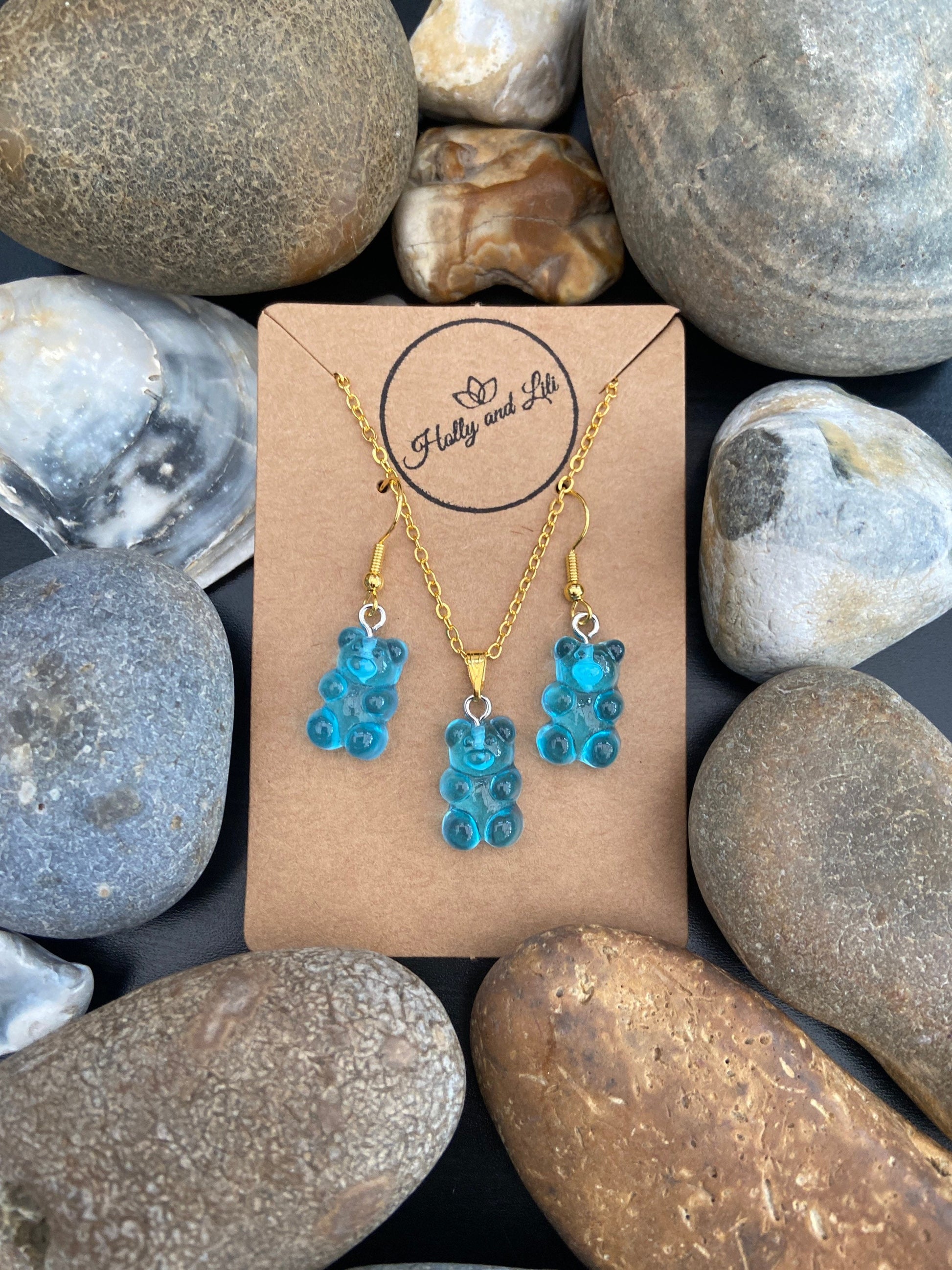 Gummy Bear Novelty Necklace & Earring Set in Blue, Blue Gummy Bear Earrings, Blue Teddy Bear Necklace, Bear Jewellery Set, Novelty Gift Set