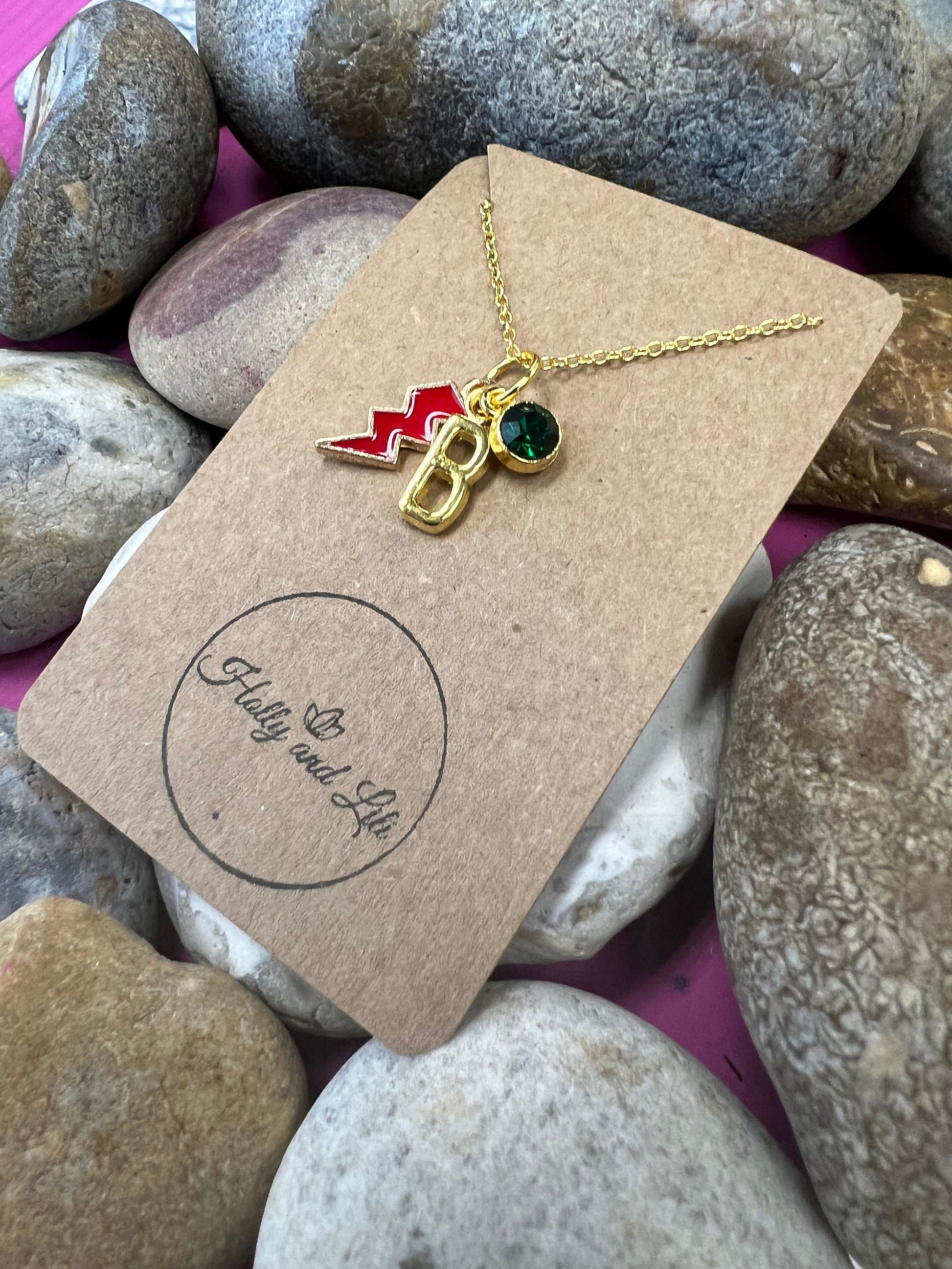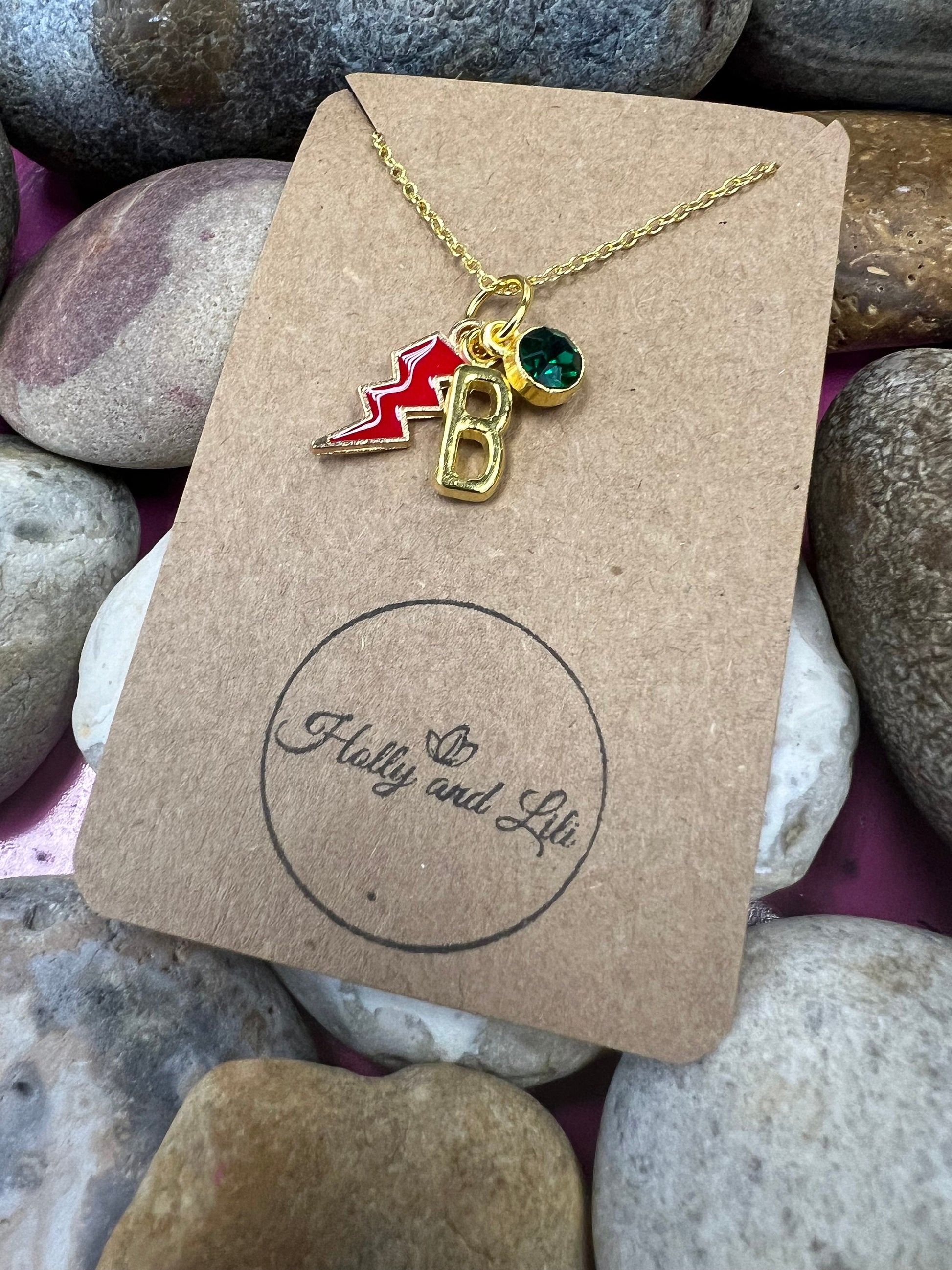 Lightning Red Green Novelty Pendant Necklace, Personalised Lightning Chain, Flash, Alphabet & Birthstone, First Necklace, Light Bolt, Bff